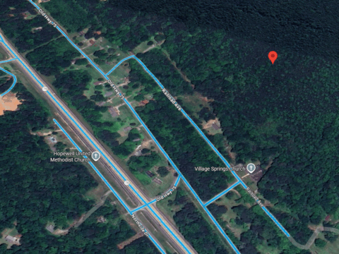 - Plug 33.75328, –86.63623 into your phone’s map app.